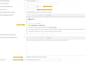 Mit dem Plugin "Erinnerung" (Original-Titel "Reenagement") kann man in moodle automatisiert E-Mails an Kursteilnehmende verschicken, die die festgelegten Voraussetzungen erfüllen. Pro Kurs können beliebig viele Erinnerungen angelegt werden. Die Einrichtung einer Erinnerung ist nicht allzu komplex, erfordert aber durchaus eine Einarbeitung.